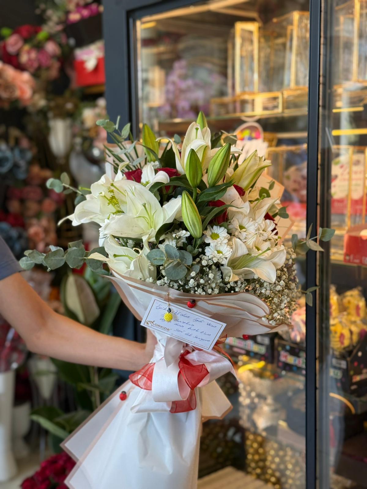 LİLYUM BEYAZ PAPATYA VE KIRMIZI GÜL BUKETİ