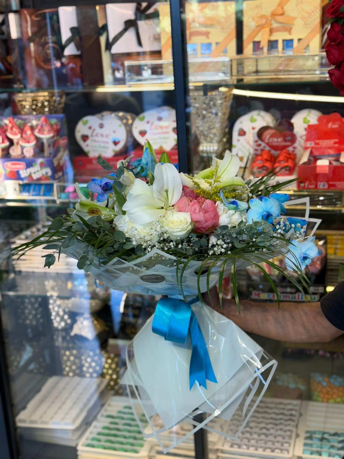 Ürün Adı: Mavi Orkide, Papatya, Şakayık & Gül Buketi